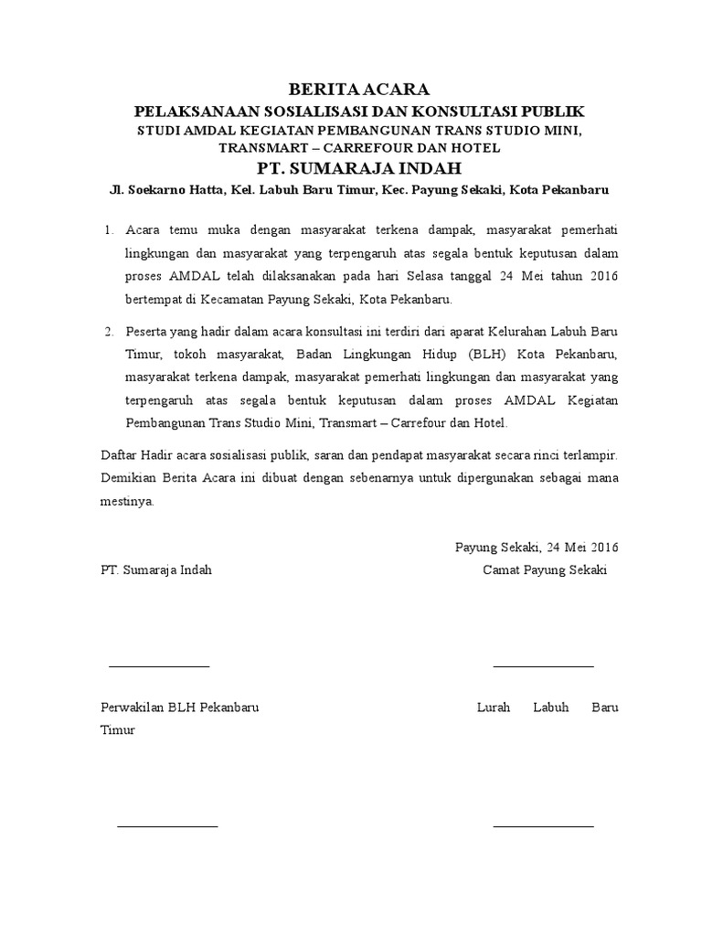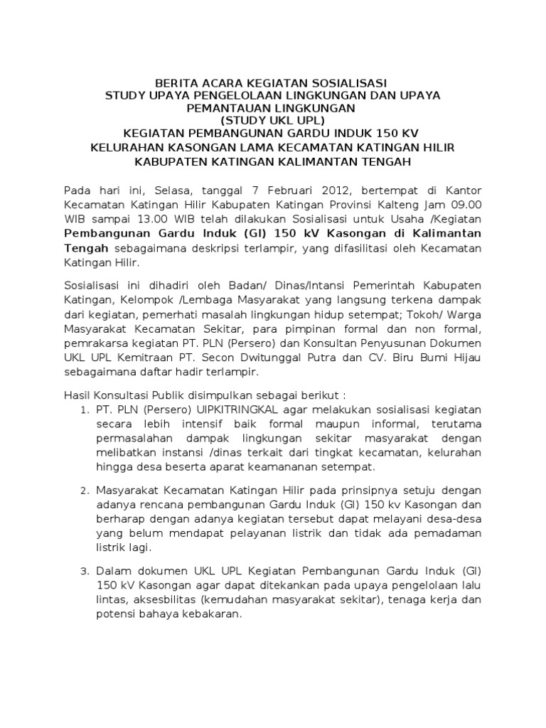Ringroad Barat No99 Salakan RT 08026 Trihanggo Gamping Sleman Pada hari ini Jumat tanggal 01 Juli 2016 pukul 1700 WIB sd 1800 WIB yang dihadiri sejumlah perwakilan warga lingkungan dukuh. Bagi suatu permasalahan masalah baik berupa pelaksanaan perencanaan ataupun pengendalian kebijaksaan pimpinan. BERITA ACARA KEGIATAN SOSIALISASI STUDY UPAYA PENGELOLAAN LINGKUNGAN DAN UPAYA PEMANTAUAN LINGKUNGAN STUDY UKL UPL KEGIATAN PEMBANGUNAN GARDU INDUK 150 KV KELURAHAN KASONGAN LAMA KECAMATAN KATINGAN HILIR KABUPATEN KATINGAN KALIMANTAN TENGAH Pada hari ini Selasa tanggal 7 Februari 2012 bertempat di Kantor Kecamatan Katingan Hilir Kabupaten Katingan Provinsi Kalteng Jam 0900 WIB sampai 13.