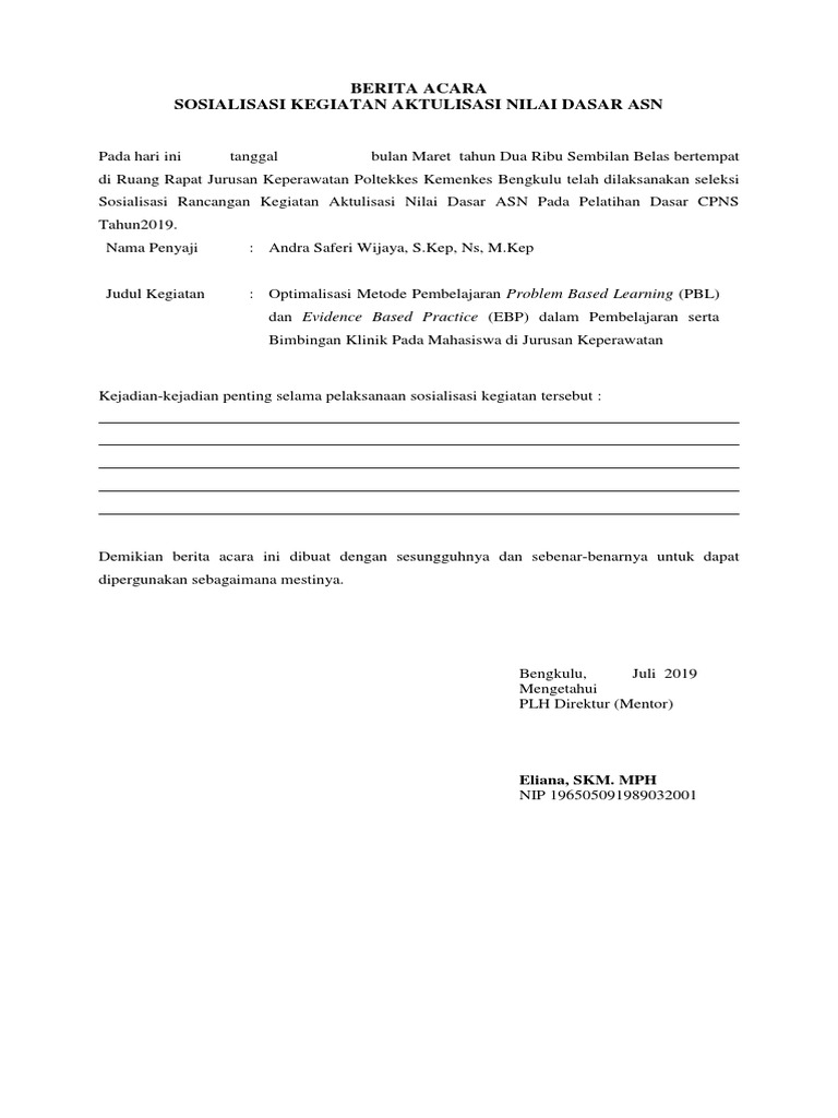 Berita acara kegiatan sosialisasi. Rabu 20 Mei 2020 dilaksanakan sosialisasi untuk menindaklanjuti surat edaran Rektor Universitas Udayana Nomor 12UN14SE2020 tentang peningkatan peringkat Webometrix Universitas Udayana oleh pihak Rektorat Universitas Udayana. Untuk itulah sebuah perusahaan atau instansi memiliki banyak karyawan dan pegawai yakni menjalankan pekerjaan sesuai dengan tugasnya masing - masing. Perubahan jadwal belajar kelas VII menjadi siang Demikian Berita Acara ini dibuat dengan sesungguhnya untuk dipergunakan sebagaimana mestinya.