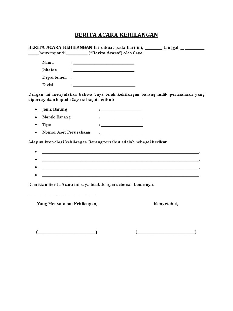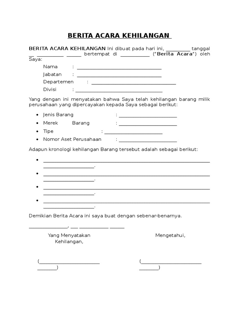 Berita Acara Kehilangan Barang Perusahaan. Kehilangan barang milik sekolah. Namun mungkin saja karyawan tersebut kehilangan barang dari inventaris kantor baik itu karena lalai maupun karena hal lainnya.