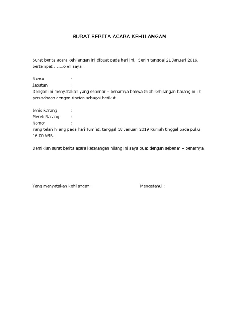 Contoh Surat Pernyataan Kehilangan Barang Inventaris Karena jika kita kehilangan suatu barang atau dokumen yang penting apalagi barang dokumen tersebut adalah milik perusahaan maka harus dibuat pernyataan hilang dengan membuat surat berita acara kehilangan dan akan melaporkannya ke pihak kepolisian maka kita harus melampirkan surat berita acara kehilangan. Karyawan Dengan ini menyatakan dengan sebenar-benarnya bahwa Saya telah. Contoh surat laporan kehilangan barang perusahaan.