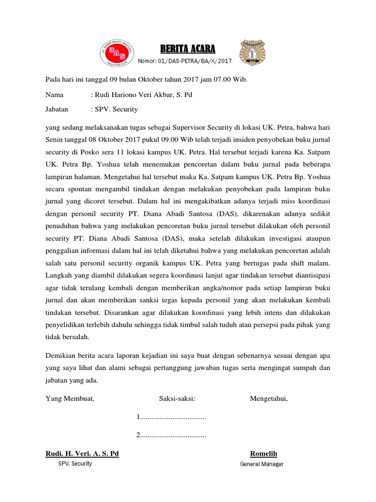 Berita acara kejadian satpam. PRINSIP - PRINSIP PENUNTUN SATPAM - JANJI SATPAM PRINSIP-PRINSIP PENUNTUN SATUAN PENGAMANAN SATU Kami anggota satuan pengamanan memegang teguh disiplin patuh dan taat pada pimpinan. Berita acara adalah laporan suatu kejadian diambil dari keterangan-keterangan saksi pelaku atau korban. Selain itu berita acara juga dijadikan oleh instansi atau perusahaan sebagai sebuah bukti legal mengenai peristiwa tertentu serah terima transaksi jual beli insiden tertentu dan masih banyak lagi yang lainnya.