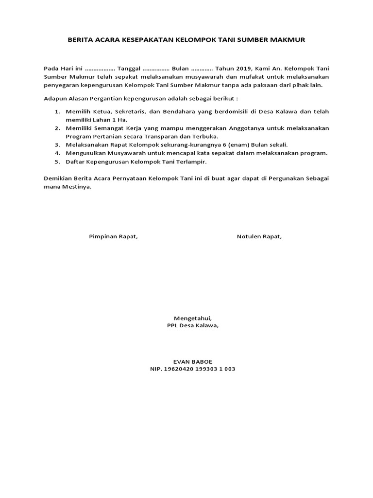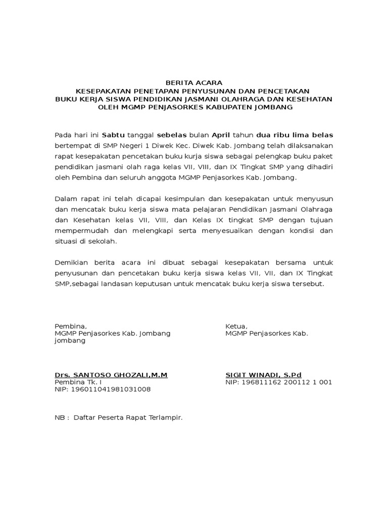 Berita acara kesepakatan bersama pdf. Perumahan Bumi Anugerah Sejahtera Desa Rajeg Kecamatan Rajeg Kabupaten Tangerang tentang Berita Acara Peraturan dan Ketentuan kegiatan Non Muslim yang ditandatanganidisetujui oleh Ketua Rt. Berita acara blt dana desa merupakan dokumen legal yang berisi hasil kesepakatan bersama dalam musyawarah desa insidentil atau khusus terkait siapa saja keluarga miskin penerima bantuan langsung tunai blt dana desa. Itulah yang dapat kami bagikan terkait contoh surat berita acara kesepakatan bersama.