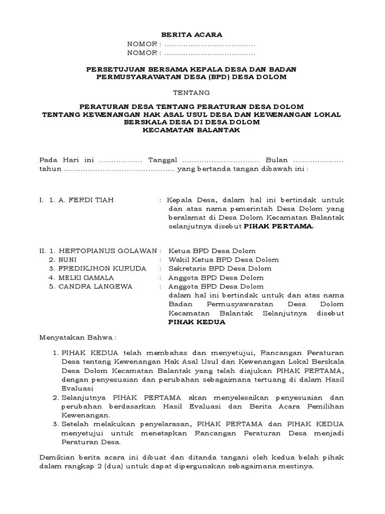 Adapun hasil kesepakatan dan komitmen dan pertemuan itu sebagai berikut. Berikut kami bagikan Draft Berita Acara kesepakatan bersama Kepala Desa dan BPD tentang Rancangan Peraturan Desa tentang pengelolaan sampah merupakan bagian lampiran tak terpisahkan dari Perdes Pengelolaan Sampah yang bisa Anda download secara gratis dalam web ini. Contoh Berita Acara Berita acara adalah sebuah naskah dinas atau surat yang di dalamnya memuat pernyataan pengesahan tentang suatu kegiatan rapat kehilangan kerusakan dan serah terima barang penyelesaian pekerjaan kejadian peristiwa perubahan status dll.