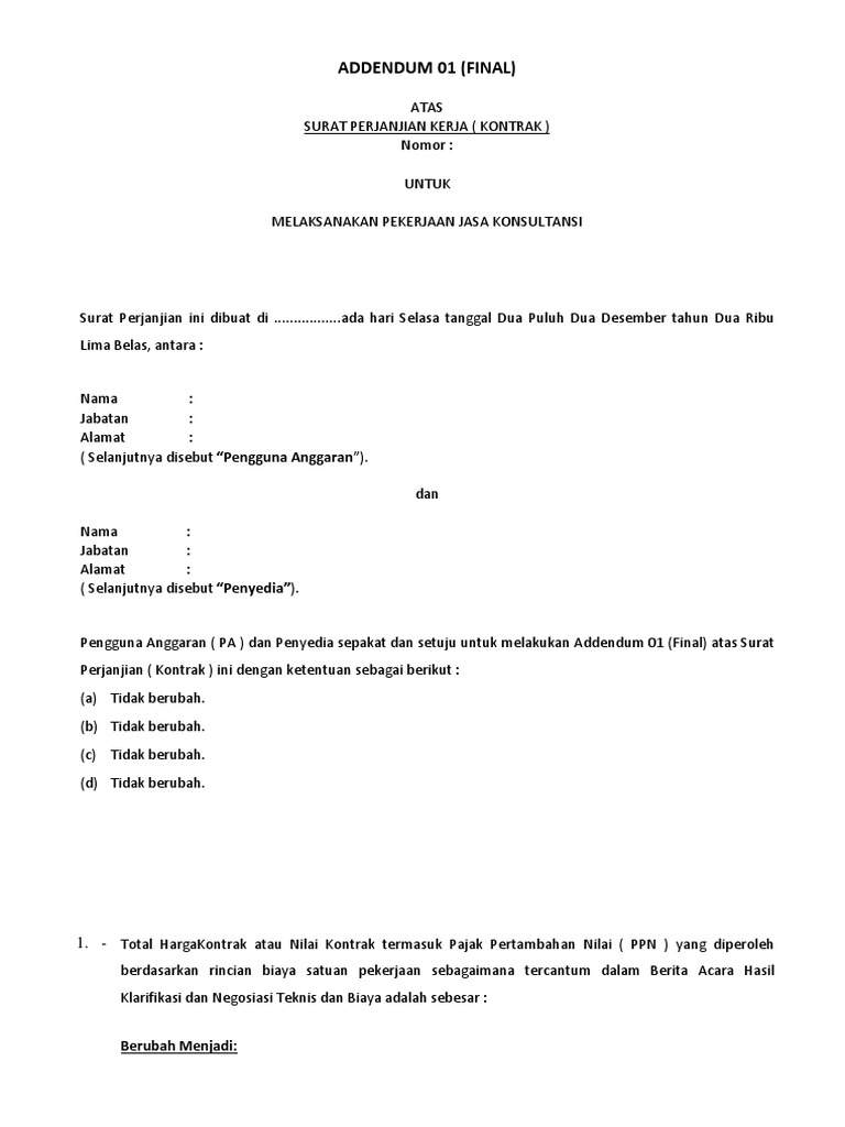 BAB XIII DAFTAR KUANTITAS DAN HARGA Tidak diubah BAB XIV BENTUK DOKUMEN LAIN Tidak diubah Demikianlah Addendum Berita Acara Penjelasan Pekerjaan ini dibuat untuk dimaklumi. Contoh Surat Berita Acara Perubahan Harga have an image associated with the otherContoh Surat Berita Acara Perubahan Harga It also will feature a picture of a sort that might be observed in the gallery of Contoh Surat Berita Acara Perubahan Harga. Di mana telah masuk dalam rangka promosi suatu barang atau sebagai sistem kerja sama antar perusahaan.