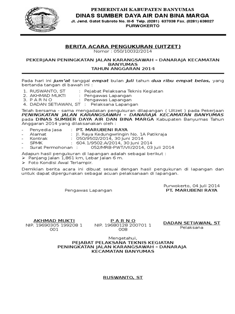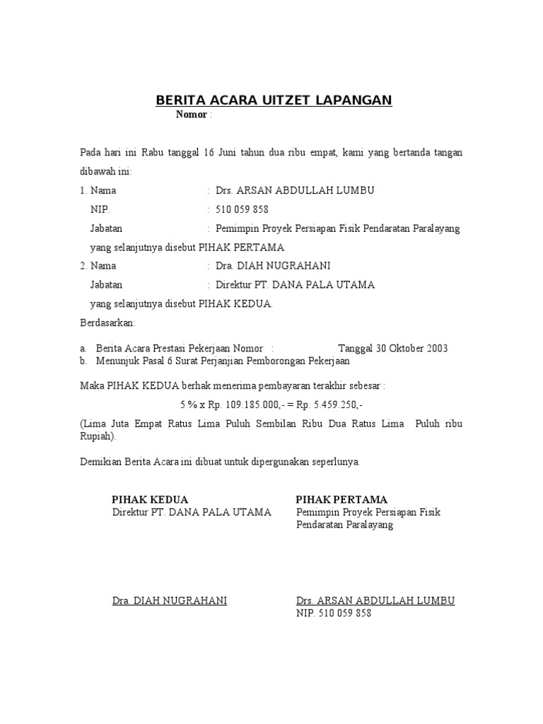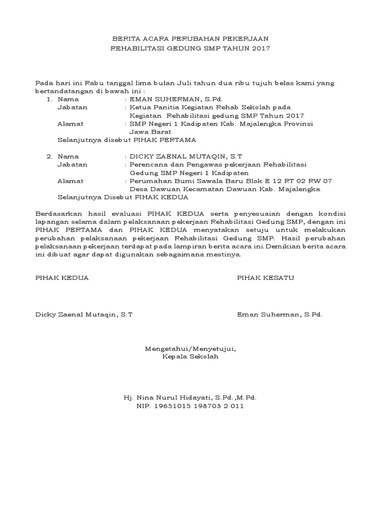 Demikian Berita Acara Persetujuan Kemajuan Pelaksanaan Pekerjaan untuk Pembayaran Angsuran termyn ini dibuat dan ditandatangani di Madiun pada tanggal tersebut diatas dalam rangkap secukupnya untuk dipergunakan. 15 Contoh Surat Berita Acara Berbagai Kegiatan dan Keperluan - Dalam menjalankan sebuah perusahaan atau instansi tentu saja semuanya tidak bisa dilakukan oleh seorang pimpinan. SUADI Diperiksa Oleh.