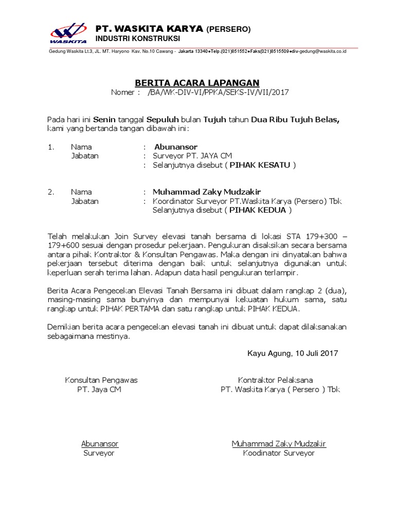 Berita acara pekerjaan lapangan. You just clipped your first slide. 20050105 Berita Acara Serah Terima Akhir Pekerjaan 2 Berita Acara Lapangan Blog Archives Moteharmony Ketika Surat Pemberitahuan Dan Surat Panggilan Dikirim Manual Book Pemeriksaan Pajak 9 Contoh Berita Acara Rapat Kejadian Kegiatan Kehilangan Samsat Cerita Dan Perjalanan Doc Berita Acara Kemajuan Pekerjaan Nofiehendra Wati. Itulah ulasan mengenai pengertian berita acara fungsi cara membuat berita acara dan contoh berita acara versi lengkap.