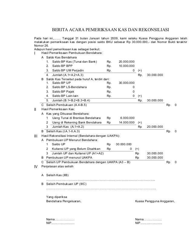 Berita acara pemeriksaan kas dan rekonsiliasi. Lampiran Berita Acara ini yang merupakan bagian yang tidak terpisahkan dari Berita Acara ini. Telah melakukan pemeriksaan kas Bendahara Penerimaan dengan nomor rekening. Anggaran format bos k7a rekap penggunaan dana format bos k7b register penutupan kas.