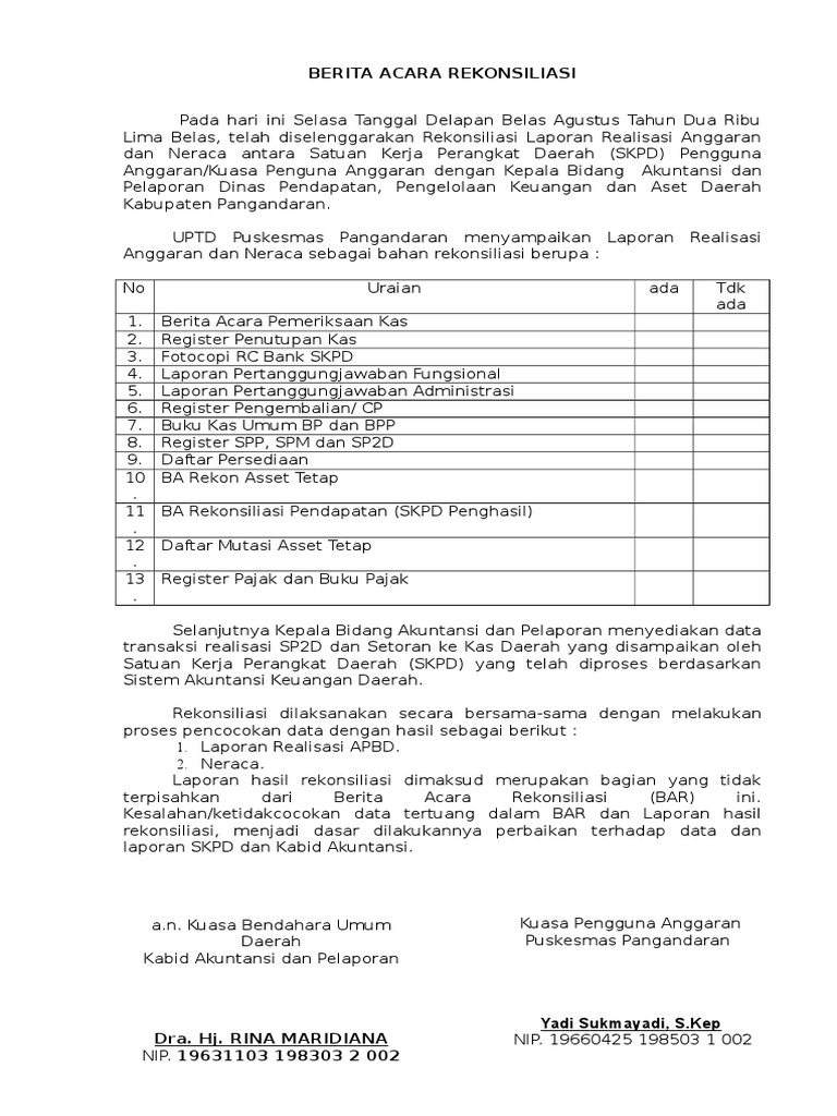 BAR-332703200803112020 Pada Hari ini Rabu Tanggal 14 Bulan Oktober Tahun 2020 telah diselenggarakan Konfirmasi dan Rekonsiliasi Data Kumulatif Sisa Dana Desa Tahun 2015 sd 2018 antara Badan Pengelola Keuangan Daerah atau yang. Sesuai dengan Peraturan Menteri Dalam Negeri Republik Indonesia Nomor 13 Tahun 2006 tanggal 15 Mei 2006 kami melakukan pemeriksaan setempat pada. Pada video ini Bapak Sutiono Widyaiswara Pusdiklat Anggaran dan Perbendaharaan menjelaskan terkait dengan bagaimana cara mudah membuat berita acara pemeriksaan kas dan rekonsiliasi Read More 29.