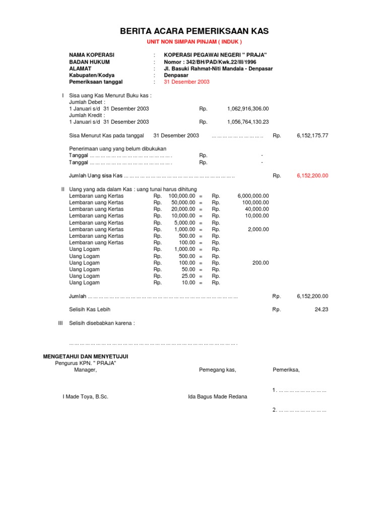 Sukasukaane 31 Desember 2014. Untuk lebih jelasnya berikut adalah contoh Berita Acara Pemeriksaan Kas untuk proyek atau pembangunan sekolah yang menggunakan uang negara. Pada hari ini jumat tanggal dua puluh sembilan mei dua ribu.