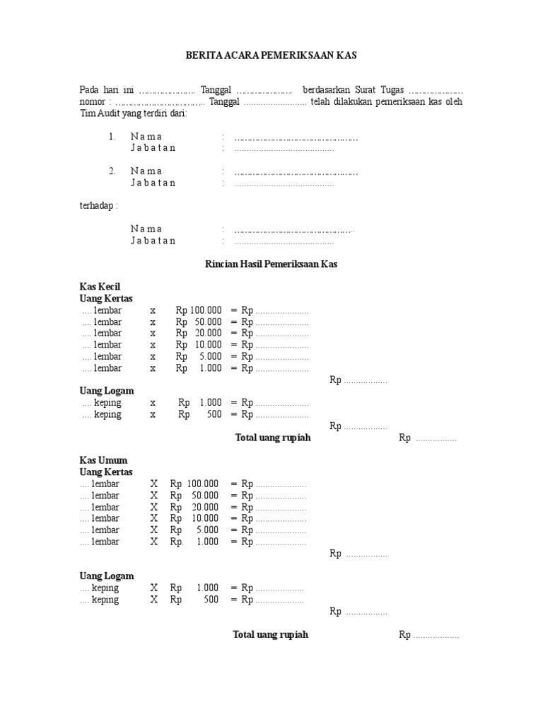 RPP daring 1Satu lembar. Berita acara dalam sebuah sistem administrasi sangat penting untuk dibuat salah satunya adalah berita acara pemeriksaan kas oleh kepala sekolah kepada bendahara pemegang kas kemudian setelah dibuatkan berita acara pemeriksaan maka dibuatkan lagi regiter penutupan kas yang berisi keseluruhan tunai kas yang telah diperiksa oleh kepala sekolah scara rinci baik jumlah uang kertas pecahan seratus. KABUPATEN GOLDEN WATER BERITA ACARA PEMERIKSAAN KAS Pada hari ini senin tanggal sembilan belas bulan Desember tahun dua ribu sebelas.