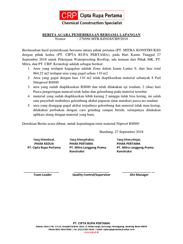 Berita acara pemeriksaan hasil pekerjaan. Laporan mc 0 ini dilengkapi dengan berita acara pemeriksaan lapangan bersama mc 0 berita acara serah terima lapangan ba mc 0 schedule dan rekap mc 0. Format Berita Acara Pemeriksaan Pekerjaan Contoh Berita Acara Penyerahan Pekerjaan Surat Kerja.