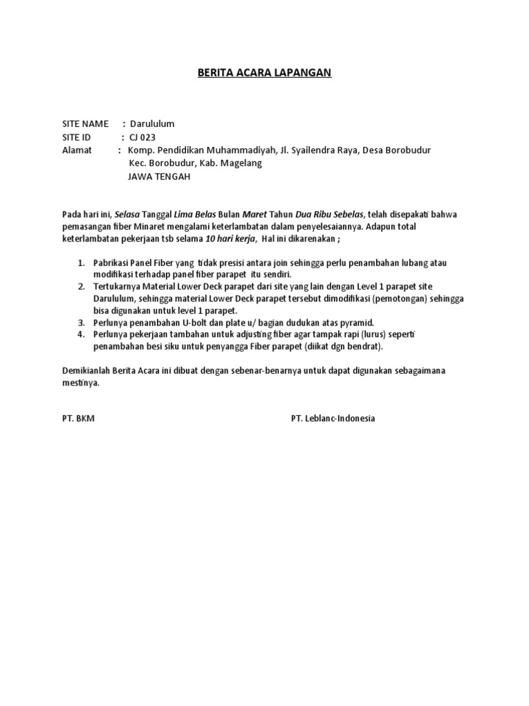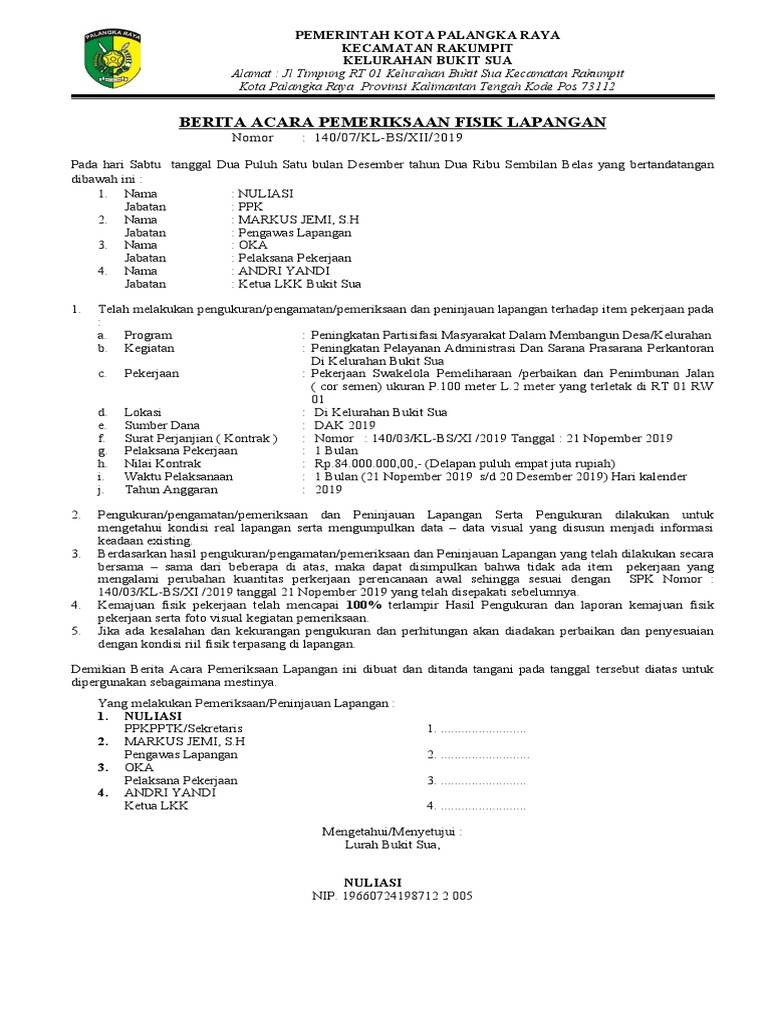 Berita acara pemeriksaan pekerjaan lapangan. PERSYARATAN SPK KONTRAK No. Pemeriksaan lapangan dilakukan paling lama 4 bulan dan dapat diperpanjang menjadi paling lama 8 bulan yang dihitung sejak tanggal Surat Perintah Pemeriksaan hingga tanggal laporan hasil pemeriksaan. Pada video ini Bapak Widhayat Rudhi Windarta Widyaiswara Pusdiklat Anggaran dan Perbendaharaan akan memberikan pemahaman terkait format dokumen dan cara pengisian Berita Acara Pemeriksaan BarangPekerjaan.