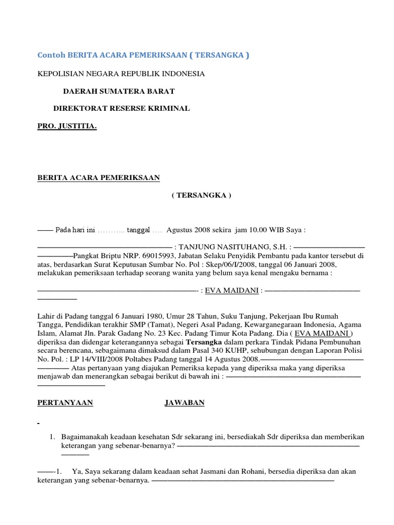 Berita acara pemeriksaan tersangka pdf. Contoh Surat Dokter Sakit Maag. Pemeriksaan Tersangka maupun Saksi di Kepolisian pada dasarnya diatur dalam UU No. 33 Full PDFs related to this paper.