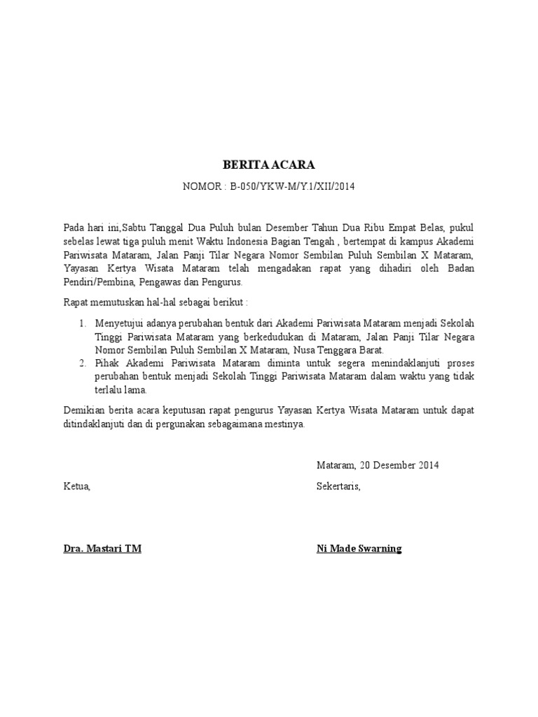 Contoh Berita Acara Berita acara adalah sebuah naskah dinas atau surat yang di dalamnya memuat pernyataan pengesahan tentang suatu kegiatan rapat kehilangan kerusakan dan serah terima barang penyelesaian pekerjaan kejadian peristiwa perubahan status dll. Berita Acara Penjelasan Pekerjaan Pekerjaan Aanwijzing via wwwunpadacid Contoh Berita Acara Pergantian Pengurus - Jobs Id 2017 via jobsid2017blogspotcoid Rw 5 Karanglo Karangdukuh. Dalam rapat ini membahas mengenai Pendirian YAYASAN ISLAM AL-GHOZALY SUWAWAL dalam rapat telah memenuhi quorum dengan dihadiri oleh.