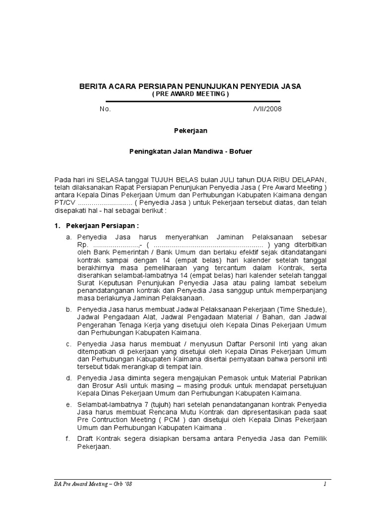 Berita acara rapat persiapan penunjukan penyedia pdf. Pada Halaman SPPBJ Penambahan Berita Acara Persiapan Penunjukan Penyedia 19. Setidaknya ada beberapa kategori rapat koordinasi yang diperlukan PPK sebelum. Itulah ulasan mengenai perbedaan topik bahasan dalam rapat pre award meeting PAM dan pre construction meeting PCM dalam sebuah rapat proyek konstruksiProyek konstruksi haruslah dikerjakan seefisien efektif dan mencapai produktivitas yang baik sehingga biaya yang dikeluarkan tidak.