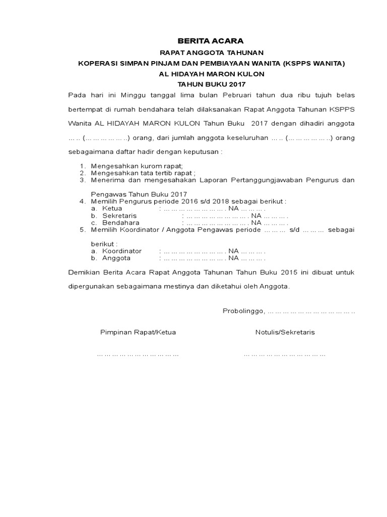 Berita acara rat koperasi. Laporan pengurus dan pengawas koperasi tahun buku 2018. Tata Cara RAT sebagai pembukaan panduan RAT ini anda bisa melihat posting saya sebelumnya tentang Rapat Anggota Tahunan Koperasi. Koperasi yang tidak dibahas dalam Rapat Anggota Tahunan Pasal 7 1 Rapat Anggota untuk meminta pertanggungjawaban Pengurus dan Pengawas yang dilaksanakan paling sedikit 1 satu kali dalam setahun dikenal dengan Rapat Anggota Tahunan RAT.