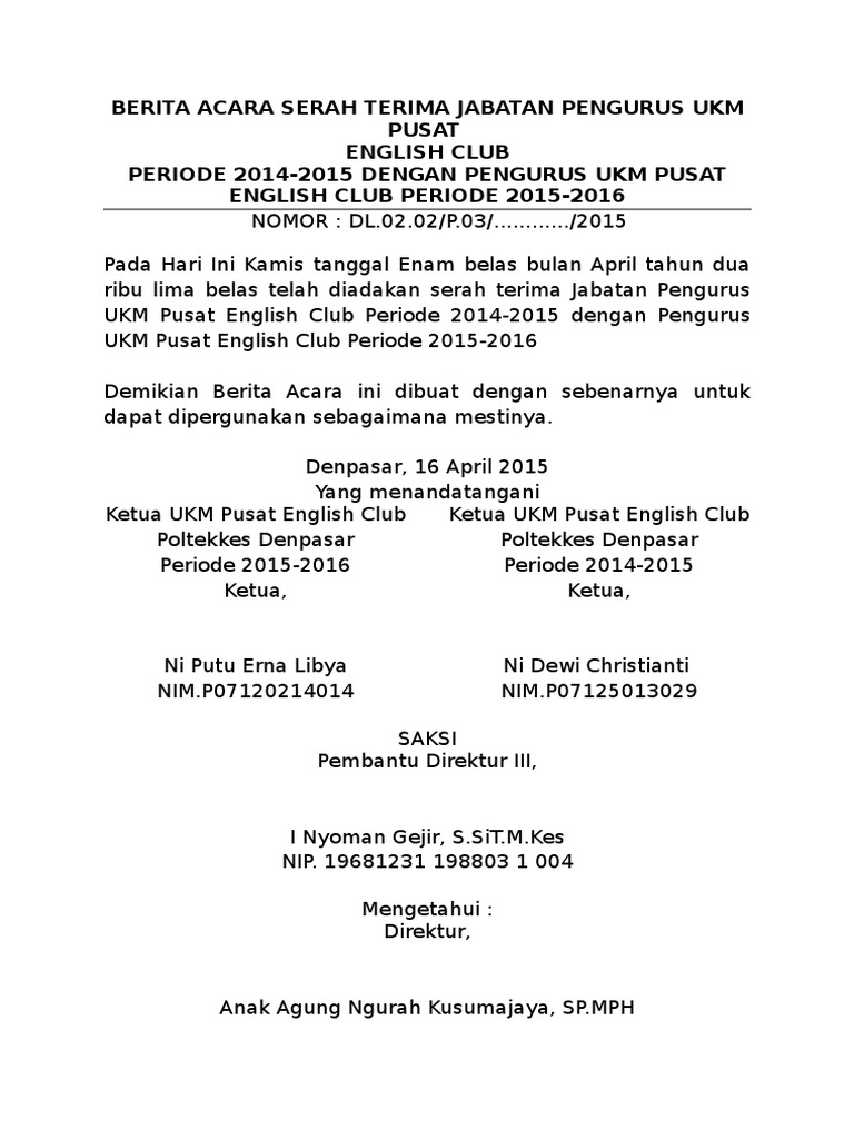 Some of these cookies are essential to the operation of the site while others help to improve your experience by providing insights into how the site is being used. Berita Acara Serah Terima Jabatan by rusly1yuliandi1r in Types School Work. Ketua umum hmj fah periode 2014 sd 2015 selanjutnya disebut pihak pertama nama.