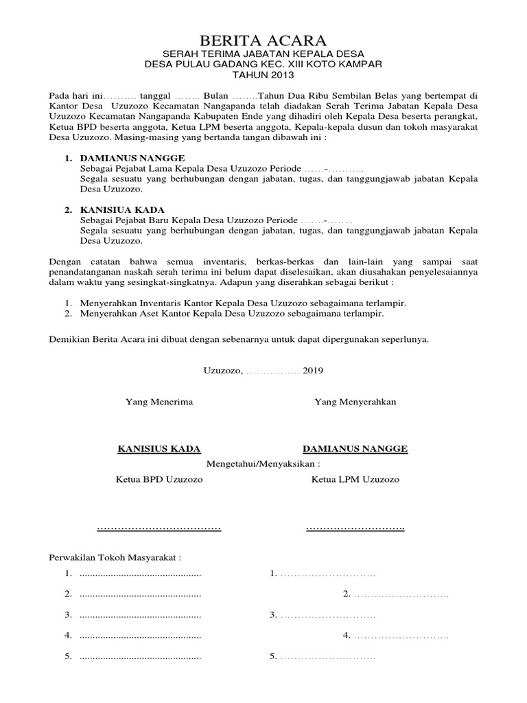 Biasanya berita acara dilakukan pada acara acara formal termasuk dalam pelaksanaan serah terima jabatan kepala desa baik dari kepada desa yang lama kepada PJ Penanggung Jawab atau dari PJ ke Kepada desa terpilih setelah. PEMERINTAH KABUPATEN ACEH UTARA DINAS PENDIDIKAN DAN KEBUDAYAAN SD NEGERI A Jln. Berita Acara Serah Terima Jabatan dari Pj Kepala Desa kepada Kepala Desa terpilih digunakan dalam proses serah terima jabatan yang dilaksanakan setelah pelantikan Calon Kepala Desa terpilih.