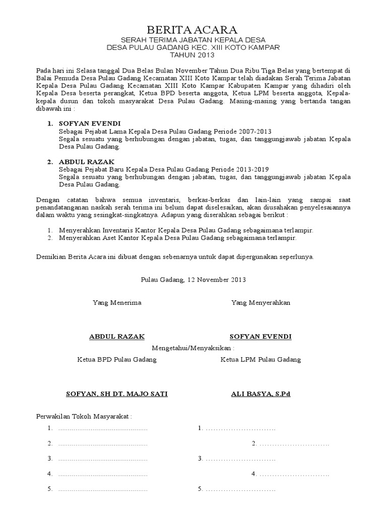 Berita acara serah terima jabatan kepala desa pdf. Penandatanganan Berita Acara Serah Terima Jabatan Kepala Desa kepala Penjabat yang baru. Contoh Berita Acara Serah Terima Jabatan Kepala Desa Berikut ini contoh format cover memori serah terima jabatan dari Pj Kepala Desa kepada Kepala. Dengan kata lain serah terima jabatan ini dilaksanakan dengan penandatanganan berita acara serah terima jabatan bersamaan dengan penyerahan naskah memori serah terima jabatan Kades.