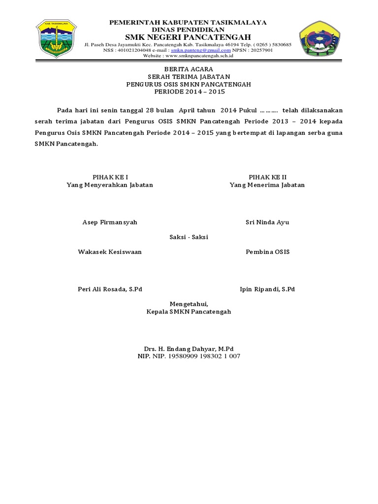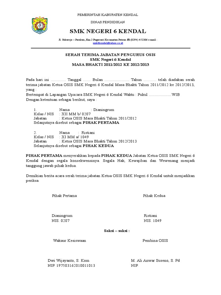 Berita acara serah terima jabatan osis smk. BERITA ACARA SERAH TERIMA JABATAN. Pelantikan tahun ini sedikit berbeda dari tahun sebelumnya karena ada prosesi pengambilan sumpah sebagai pengurus baru OSIS dan MPK dimana tahun sertijab hanya dilakukan prosesi penanda tanganan berita acara serah terima jabatan. PENGURUS OSIS SMK KESEHATAN BINA MARTA MARTAPURA.