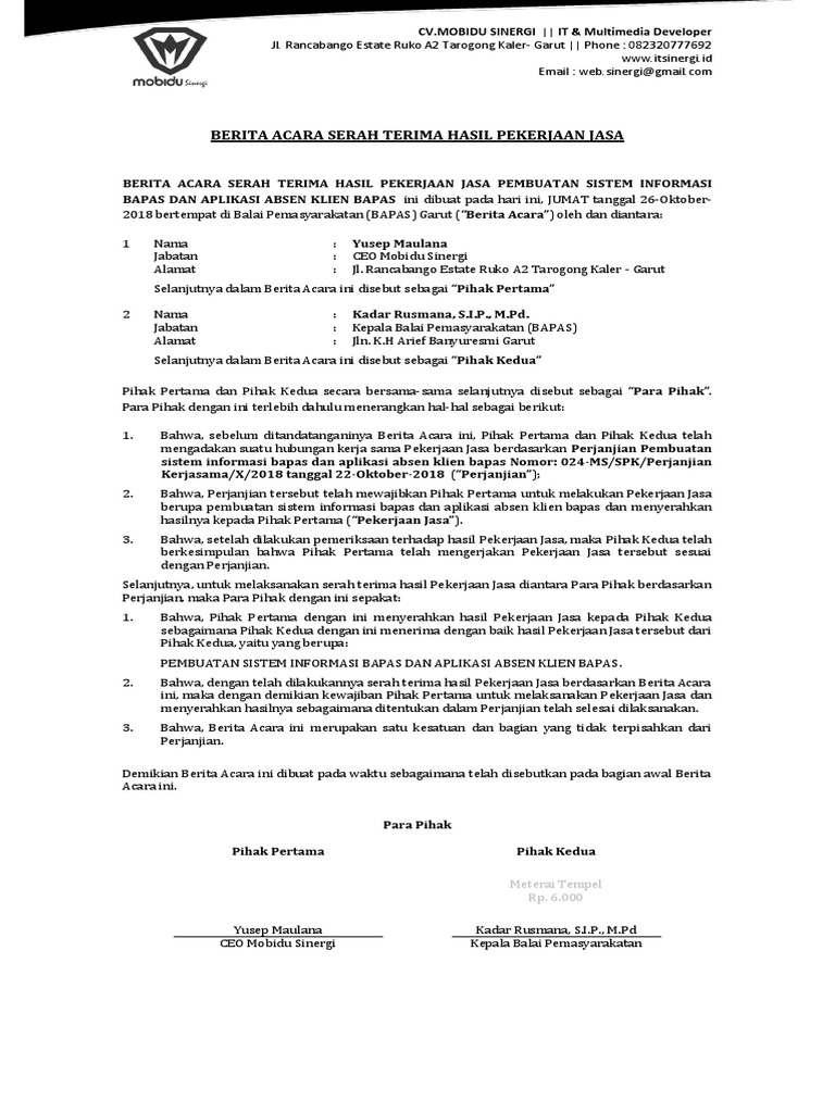 Berita acara serah terima pekerjaan jasa lainnya. Bahwa dengan telah dilakukannya serah terima hasil pekerjaan berdasarkan Berita Acara ini maka dengan demikian kewajiban PIHAK KEDUA sebagai Pelaksana Kerja Page 1 of 2 untuk menyerahkan hasil pekerjaan kepada PIHAK PERTAMA dan hak PIHAK PERTAMA sebagai Pemberi Kerja untuk menerima hasil pekerjaan tersebut dari PIHAK KEDUA berdasarkan. Bahwa dengan telah dilakukannya serah terima hasil Pekerjaan Jasa berdasarkan Berita Acara ini maka dengan demikian kewajiban Pihak Kedua melaksanakan Pekerjaan Jasa sebagaimana ditentukan dalam Pasal __ ayat ___ Perjanjian telah selesai dilaksanakan. Demikian berita acara serah terima ini di buat rangkap 2 untuk dapat digunakan sebagaimana mestinya.