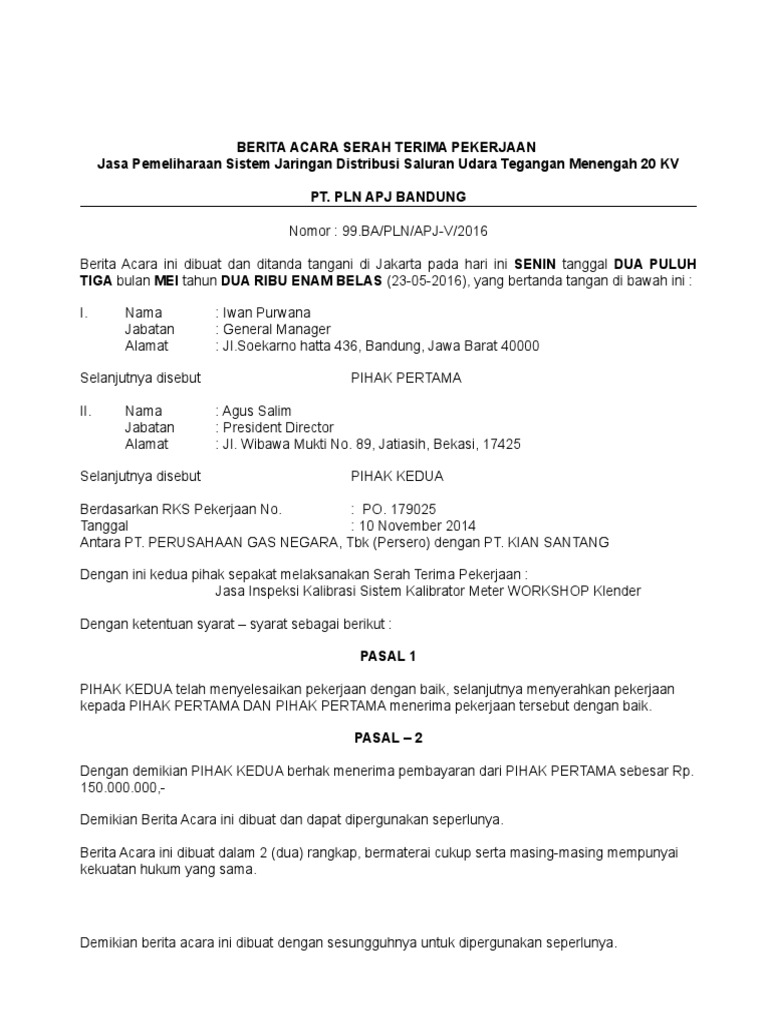 April 15th 2018 - Berita acara pemeriksaan hasil pekerjaan c Untuk pekerjaan konstruksi atau jasa lainnya yang memerlukan masa pemeliharaan Berita Acara Serah Contoh Berita Acara Serah Terima Hasil Pekerjaan. Menandatangani Berita Acara Serah Terima. Tanpa berita acara serah terima pekerjaan bast maka jasa tersebut dapat dianggap belum di terima oleh si pemberi pekerjaan.