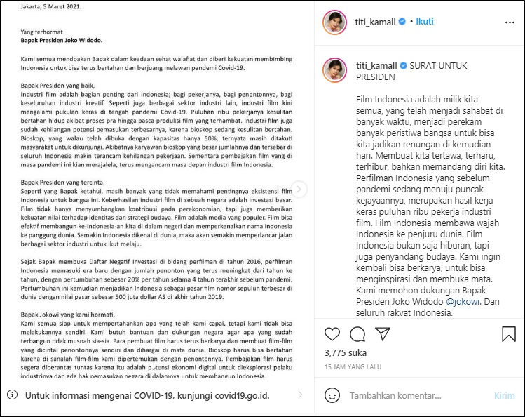 Para Sineas Kirim Surat Terbuka untuk Presiden Jokowi Ini Isinya. Bapak Presiden RI Joko Widodo di tempat. Dalam surat terbuka itu APMI berharap dibukanya kembali keran industri pertunjukan yang sejak satu tahun terakhir ini ditutup akibat pandemi Covid.