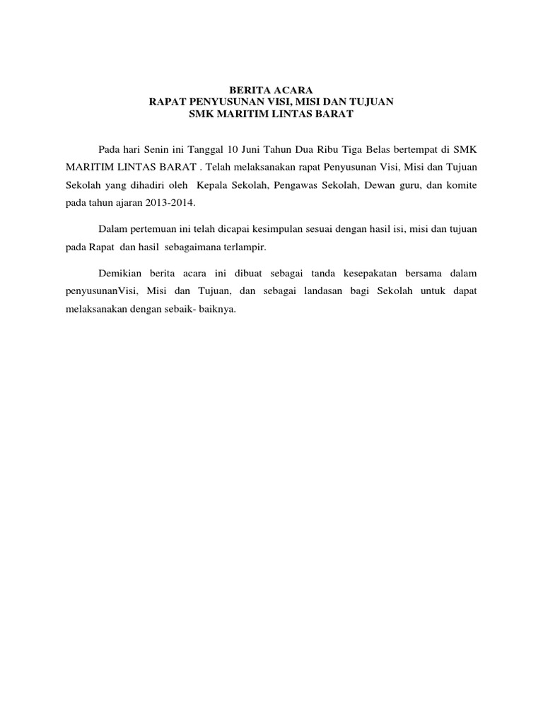 Contoh berita acara kegiatan perumusan visi misi sekolah. PANDUAN PENYELENGGARAAN MUSYAWARAH PERENCANAAN PEMBANGUNAN. Berikut Administrasi penting yang dibutuhkan dalam kegiatan Perumusan Penetapan dan Peninjauan Visi Misi Tujuan Sekolah Madrasah yang dapat anda download. Berikut ini Contoh Berita Acara Penyusunan Visi Misi dan Tujuan Sekolah.
