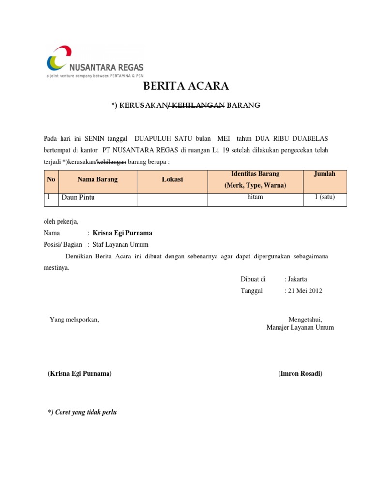 Contoh Berita Acara Kerusakan Barang Kantor