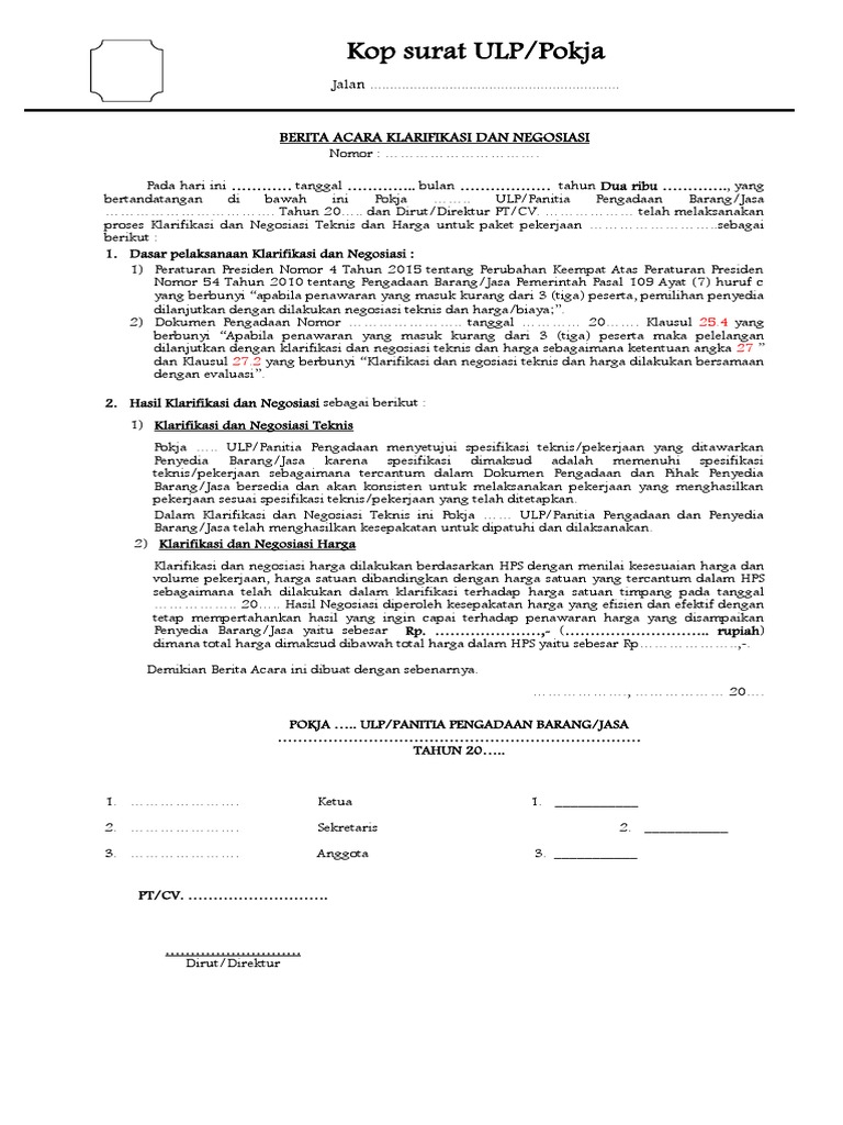 Pt Change Language Mudar idioma. Contoh Berita Acara Klarifikasi dan Negosiasi. Lampiran Berita Acara Klarifikasi dan Negosiasi Teknis dan Harga Nomor 027 432 BAKNTB PPBJ BLHD 2012 Tanggal.