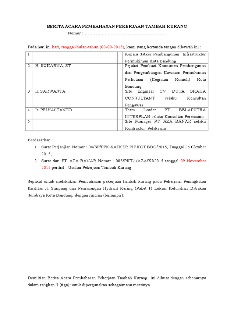 Abrir menu de navegação. Contoh Berita Acara Tambah Kurang Pekerjaan Surat Cc. Adendum akibat perubahan lingkup pekerjaan contract change order atau sering disebut adendum tambah kurang yang terbagi menjadi 4 empat jenis perlakuan yaitu.