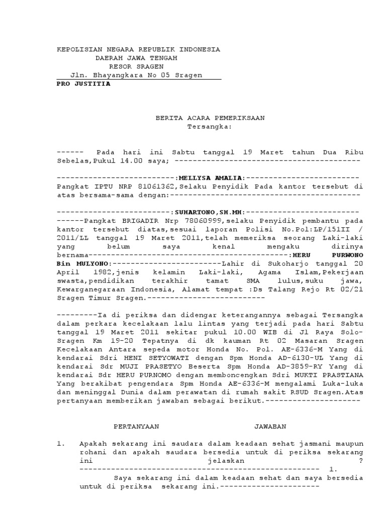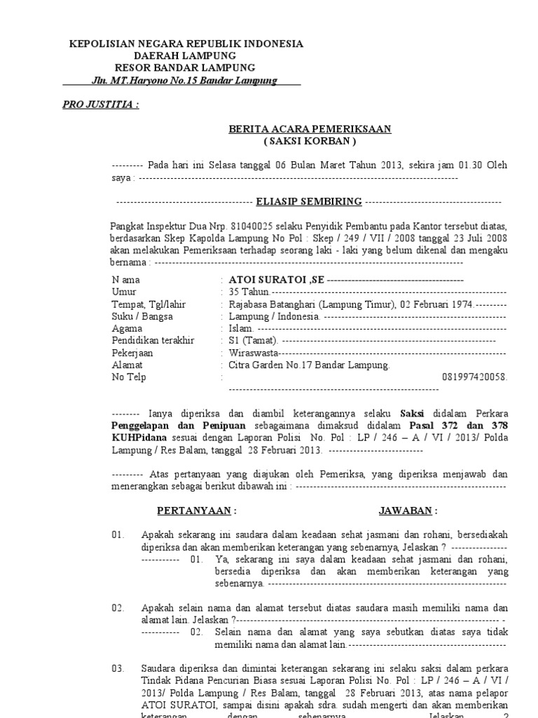 Contoh berita acara perkarabap tersangka kepolisian negara republik indonesia. Contoh Administrasi Pelaporan Kegiatan Perlindungan dan. -----Demikian Berita Acara Pemeriksaan ini dibuat dengan sebenarnya atas kekuatan sumpah jabatan sekarang ini kemudian ditutup dan ditanda tangani pada hari tanggal bulan dan tahun diatas di Kota Malang.