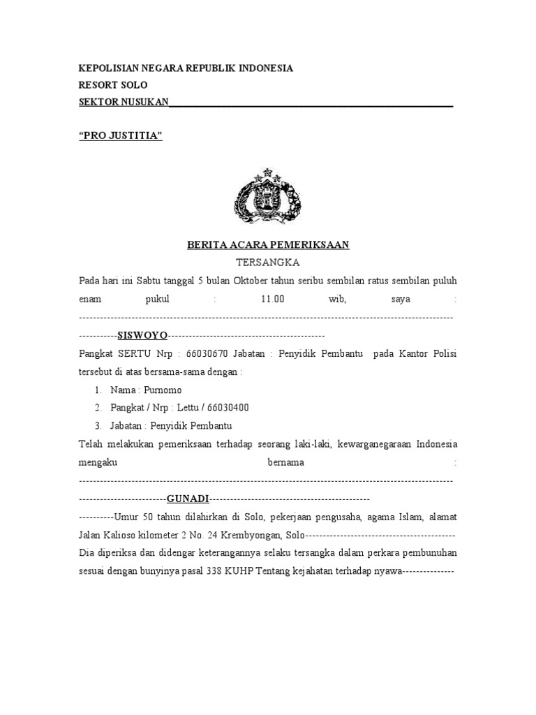 - Setelah berita acara pemeriksaan tersangka ini selesai dibuat kemudian dibaca sendiri oleh yang diperiksa tersangka dan yang diperiksa menyatakan setuju serta membenarkan kemudian untuk menguatkannya yang diperiksa turut membubuhkan tanda tangannya di bawah ini. KEPOLISIAN NEGARA REPUBLIK INDONESIA DAERAH SUMATERA BARAT DIREKTORAT RESERSE KRIMINAL PRO. Download Full PDF Package.