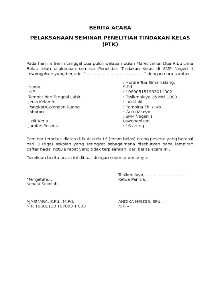 Dari pukul 0830 sampai dengan selesai Ruang. Contoh ptk contoh berita acara pelaksanaan seminar ptk kenaikan pangkat berikut ini contoh berita acara seminar ptk bagi guru sd sebagai salah satu persyaratan kenaikan pangkat dengan judul upaya meningkatkan hasil belajar matematika melalui penggunaan media konkret pada siswa kelas vi sd negeri. Lengkap dengan Contoh Format Proposal Usulan Penilaian Pemantauan Sistematika Panduan Penyusunan PTK dan lain-lain.