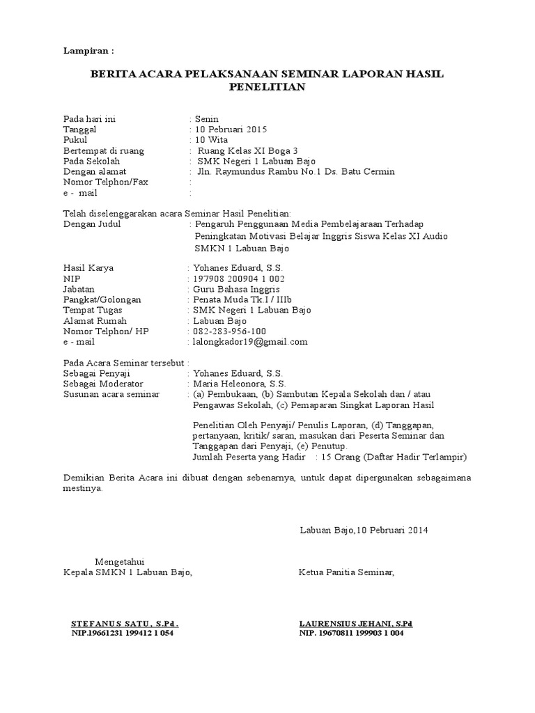 Contoh berita acara seminar penelitian tindakan kelas. BERITA ACARA PELAKSANAAN SEMINAR LAPORAN HASIL PENELITIAN Pada hari ini Tanggal Pukul Bertempat di ruang Pada Sekolah Dengan alamat Nomor TelphonFax e - mail. Baru tambah BA seminar dan perbaikannya 3. Sholawat serta salam semoga dilimpahkan kepada junjungan Nabi Muhammad SAW keluarga sahabat dan pengikutnya.