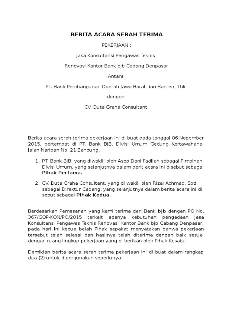 Contoh berita acara serah terima pekerjaan jasa konsultan. Contoh Surat Serah Terima Pekerjaan Yang Terbaik untuk Cuti Guru dll - Dal membuat contoh surat serah terima pekerjaan anda harus memperhatikan beberapa poin penting yang akan membuat surat anda bisa dikatakan baik dan sesuai dengan ketentuan yang berlaku di dalam penulisan surat. JL A Yani No 41 Takengon. Demikian Berita Acara Serah Terima Pekerjaan-II dibuat dalam rangkap 2 dua untuk dapat dipergunakan seperlunya di kemudian hari.