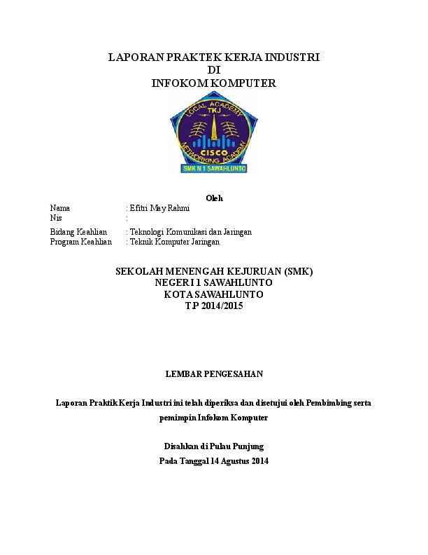 HALAMAN PENGESAHAN PEMBIMBING Yang bertanda tangan di bawah ini Guru Pembimbing Pembimbing Lapangan Praktek Kerja industri Pimpinan Elmi Computer Centre ECC dan Kepala SMK Dharma Bahari. Raya Karangsuko Tahun Pelajaran 20142015 Di Susun Oleh. Bidang Keahlian Teknologi Komunikasi dan Jaringan Program Keahlian Teknik Komputer JaringanTKJ DINAS PENDIDIKAN SMK AL KHOZINI MALANG Jl.