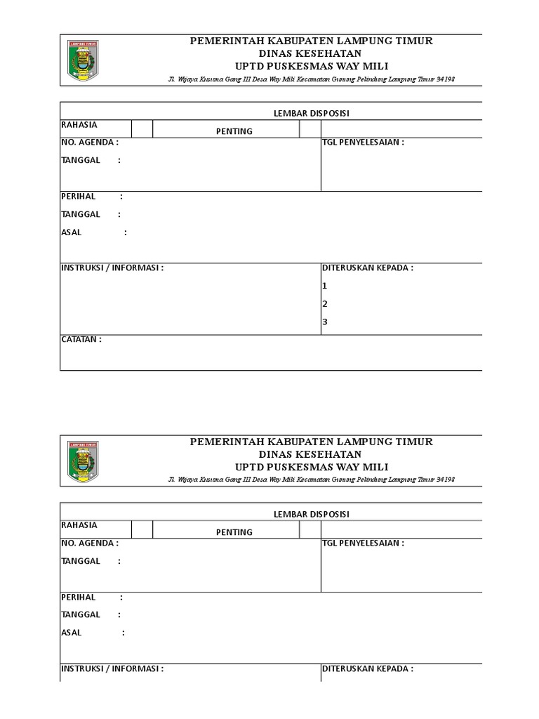 Pengisian lembar disposisi yang menyangkut masalah pengagendaan seperti indeks kode nomor urut dan data-data tentang surat dilakukan oleh bagian administrasi. BIRO ORGANISASI BIRO ORGANISASI LEMBAR DISPOSISI LEMBAR DISPOSISI Surat dari. APRIL 16TH 2018 - LEMBAR DISPOSISI DESA MAKKAWING KEC BALAI 12 31.