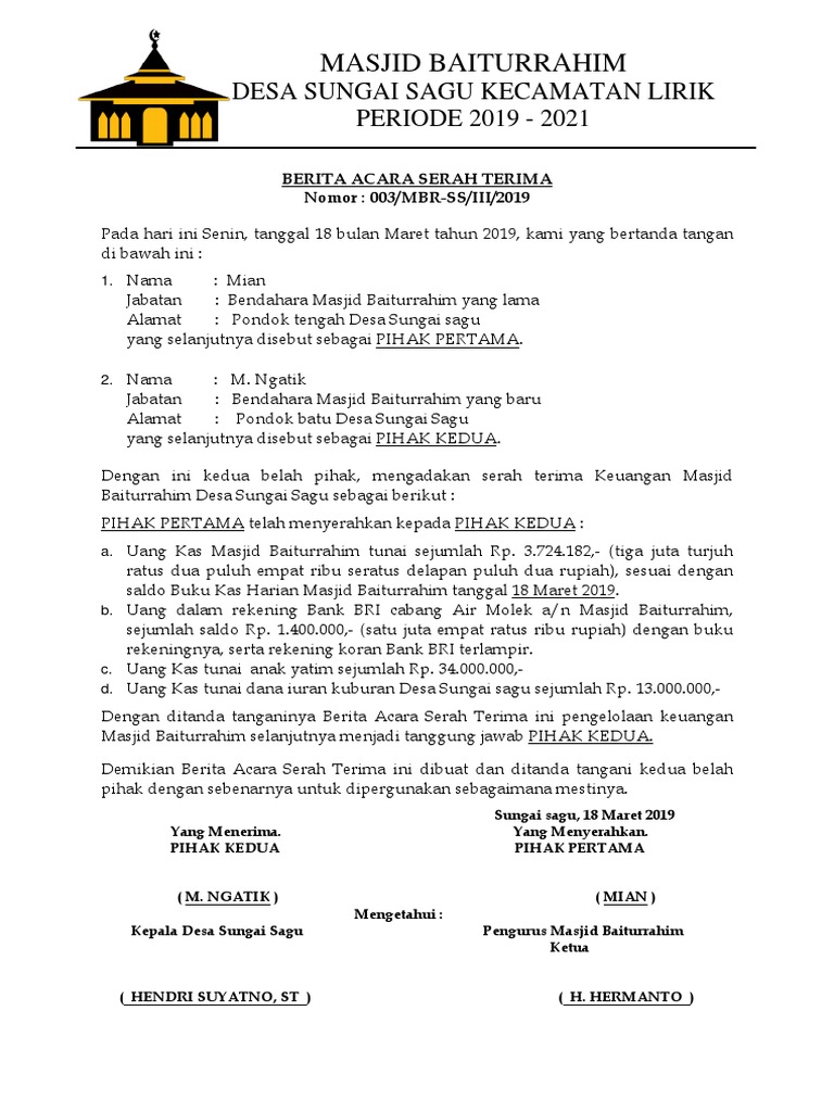 Berita Acara Serah Terima Bendahara Masjid