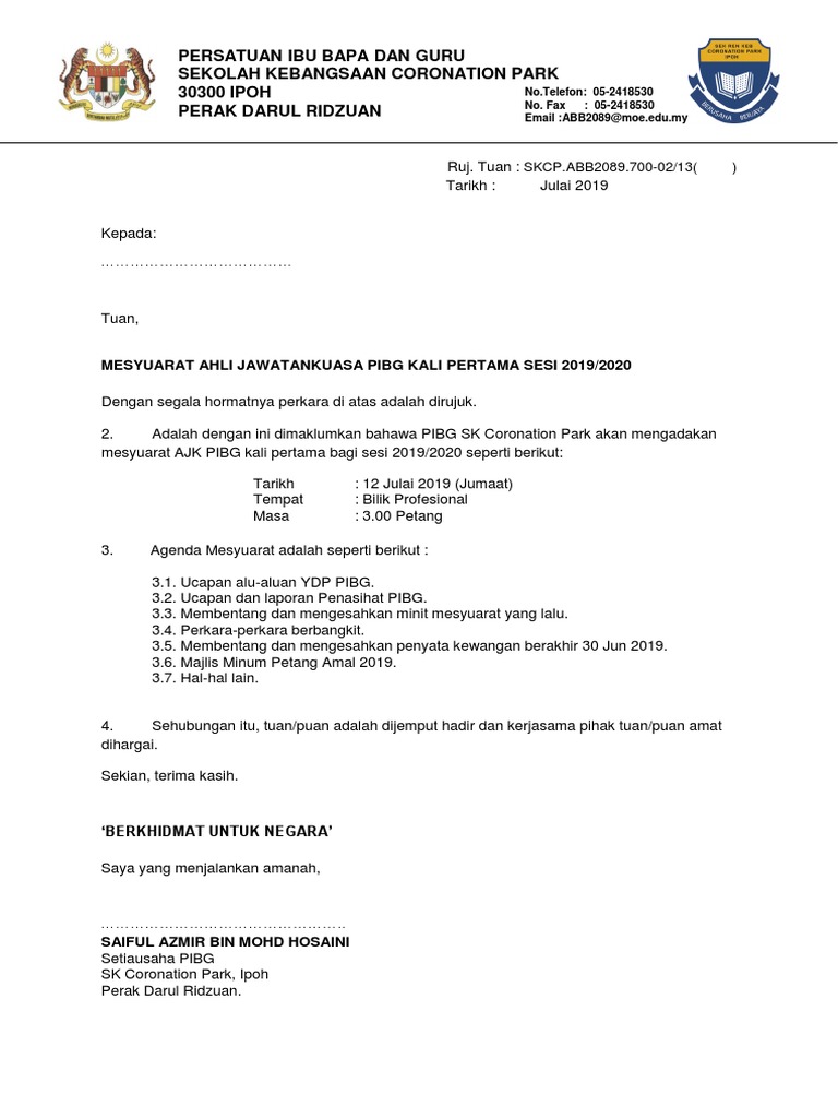 Surat Panggilan Mesyuarat Pibg Kali Ke 1 20192020