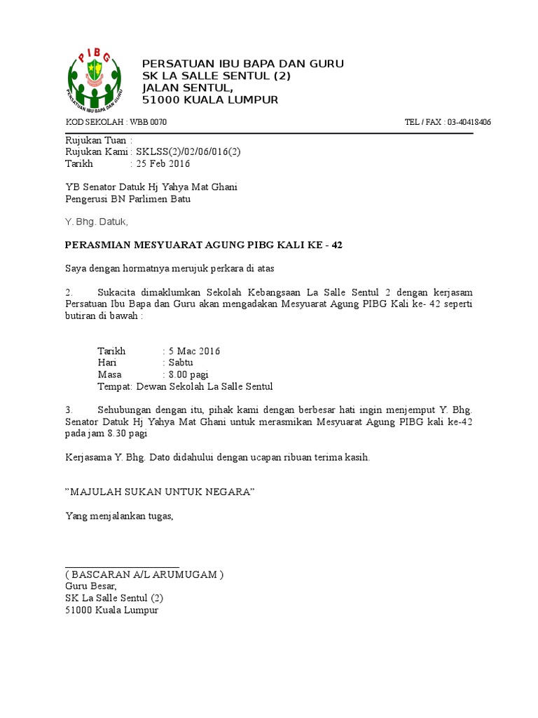 Contoh surat jemputan perasmian mesyuarat agung pibg. Surat Rasmi Mesyuarat Khabi News. Sebagai Setiausaha PIBG pelbagai surat perlu dibuatSempena Mesyuarat Agung PIBG yang akan diadakan pada hujung bulan ni CN sukacita berkongsi dengan anda Contoh Surat Jemputan Ibu Bapa ke Mesyuarat Agung PIBG untuk Mesyuarat Agung tersebutSemoga perkongsian ini bermanfaat untuk anda. Sempena mesyuarat agung pibg yang akan diadakan pada hujung bulan ni cn sukacita berkongsi dengan anda contoh surat jemputan sebagai perasmi untuk mesyuarat agung tersebut.