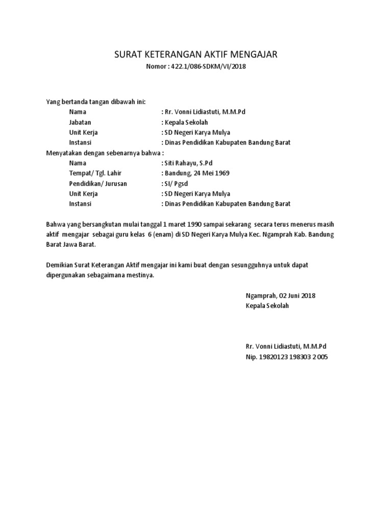 Contoh surat keterangan aktif bekerja word. Contoh surat keterangan kerja. Contoh surat keterangan kerja surat keterangan kerja di gunakan karyawan atau seseorang yang memiliki ikatan kerja untuk memberikan penjelasan atau informasi bahwasanya dia adalah sebagai pekerja dan sedang bekerja dengan ini dia akan mendapatkan sebuah konfirmasi baik terhadap orang yang bersangkutan dengan dia. Demikian surat keterangan aktif mengajar ini dibuat dengan sebenar-benarnya.