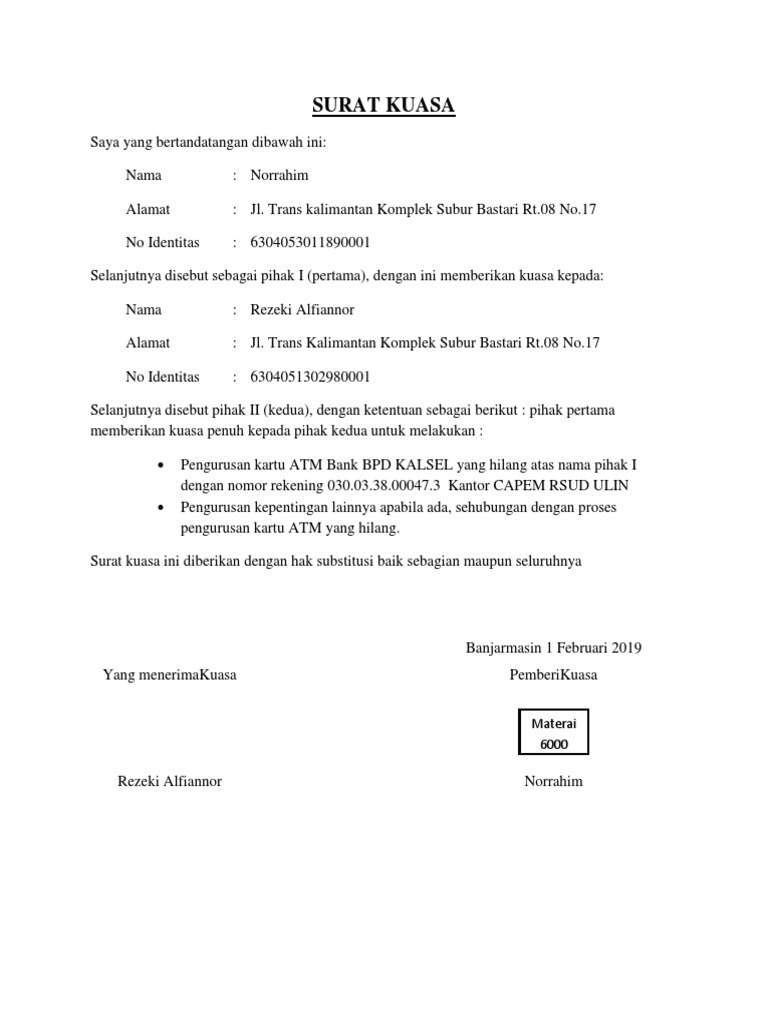Contoh Surat Kuasa Pengurusan Atm Rusak