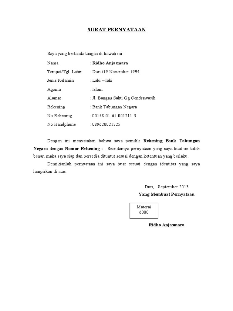 Contoh Surat Kuasa Penggunaan Rekening Bank Doc