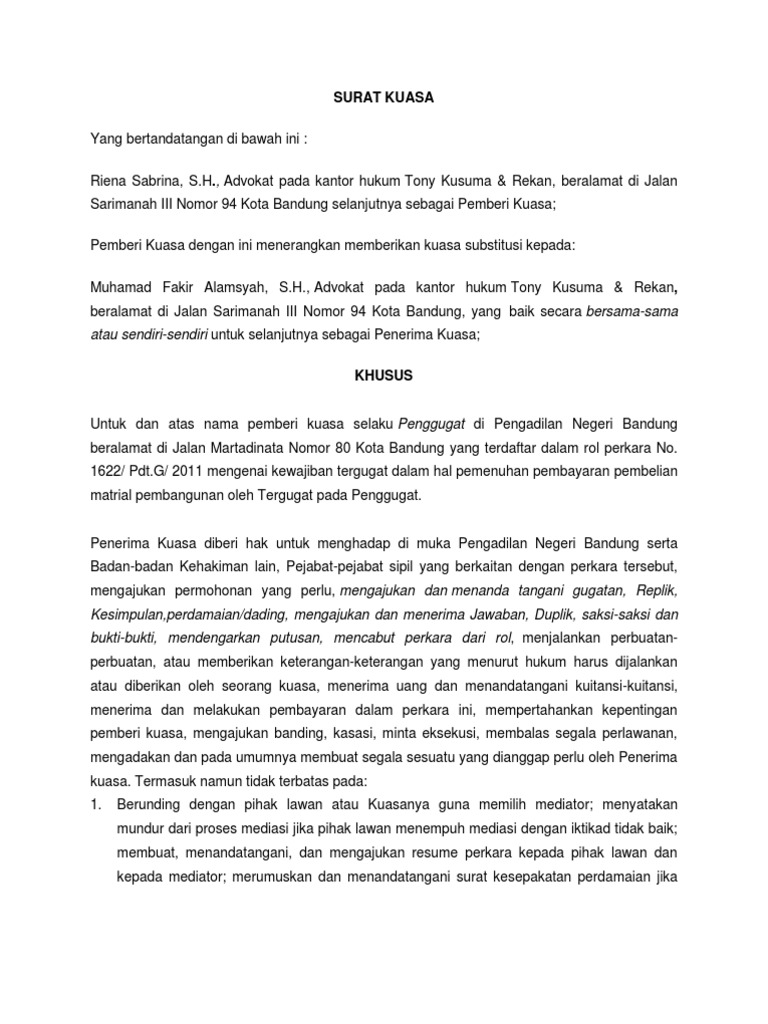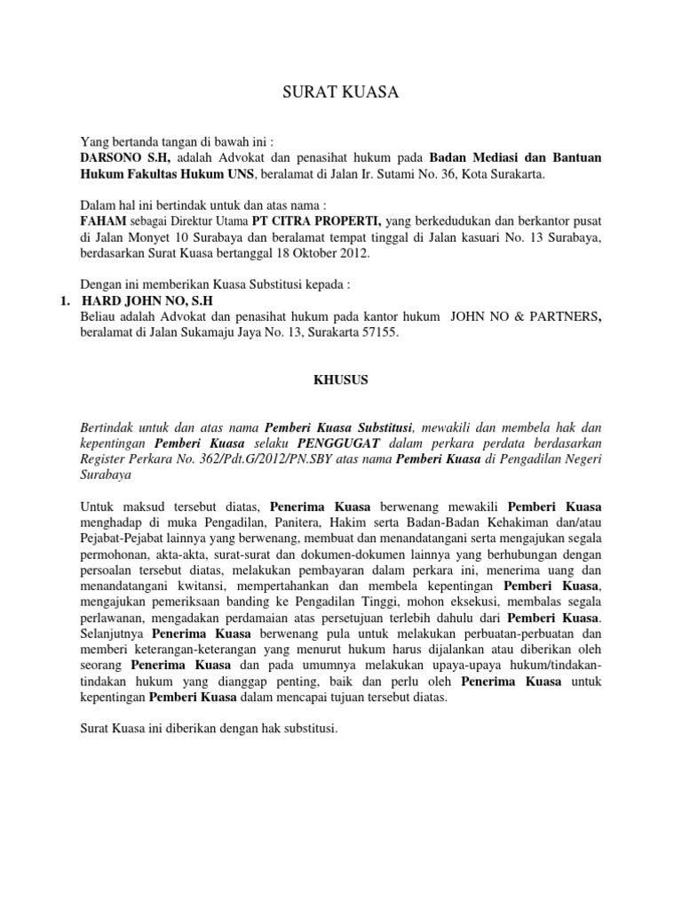 Demikian surat kuasa substitusi ini dibuat untuk dipergunakan sebagaimana mestinya. Contoh Surat Kuasa SubstitusiContoh Surat Kuasa Dalam kehidupan sosial sehari-hari disebabkan berbagai kesibukan yang tidak dapat dihindari tidak jarang seseorang berada pada situasi sulit untuk menyelesaikan semua urusan-urusan yang urgen dan mendesak misalnya mengurus dokumen perusahaan bisnis keluarga dan. Sukasenang Nomor NPWP.