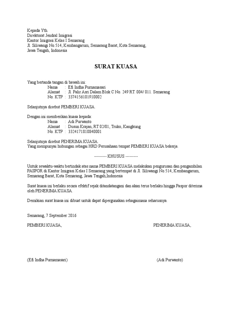 0123456789 TempatTgI Lahir. 2 Contoh Surat Kuasa Pengambilan PASPOR Berikut ini adalah 2 Contoh Surat Kuasa Pengambilan PASPOR. Untuk sewaktu-waktu bertindak atas nama PEMBERI KUASA melakukan pengambilan PASPOR di KANTOR IMIGRASI KELAS I KHUSUS SURABAYA Jl.
