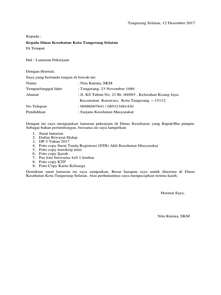 Contoh surat lamaran kerja dokter ke dinas kesehatan. Contoh pernyataan Dinas Kesehatan ini berdasarkan file pada rekrutmen pegawai Dinas Kesehatan kabSidoarjo yang dimuat pada situs rekrutmencc beberapa waktu lalu. Ini pada umumnya dibutuhkan bagi para pencari kerja yang ingin bekerja di rumah sakit klinik bersalin puskesmas ataupun tempat pelayanan kesehatan lainnya cara membuat surat lamaran kerja bidan. Contoh Surat Lamaran Kerja Untuk Ke Dinas Kesehatan - Sidoarjo berikut beberapa informasi penting yang di tulis pada surat lamaran dinas kesehatan.