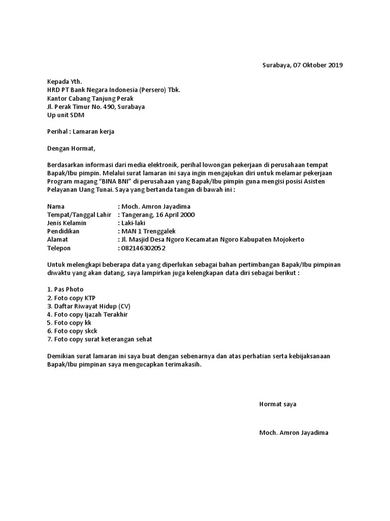 Contoh surat lamaran kerja magang bina bni. Silahkan di download dicopy dan domodifikasi sesuai dengan kebutuhan surat anda. Contoh surat lamaran magang di bni. Jember 08 Januari 2019 Perihal.