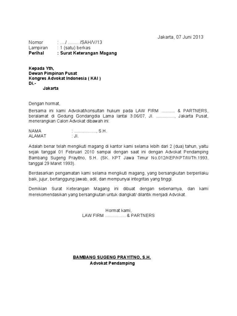 Dengan adanya magang di salah satu perusahaan menjadi hal yang baik untuk seluruh siswa ataupun mahasiswa untuk menambah pengalaman di dunia kerja sebelum masuk secara keseluruhan. Contoh Surat Magang Di Kantor Advokat have an image from the otherContoh Surat Magang Di Kantor Advokat It also will include a picture of a kind that may be seen in the gallery of Contoh Surat Magang Di Kantor Advokat. 18 Tahun 2003 Pasal 3 dimana untuk dapat diangkat sebagai advokat di wajibkan bagi calon advokat untuk menjalankan magang sekurang-kurangnya 2 dua tahun berturut-turut maka bersama dengan surat permohonan ini saya mengajukan permohonan magang di Kantor Hukum Hariyanto Partners yang bapak pimpin.