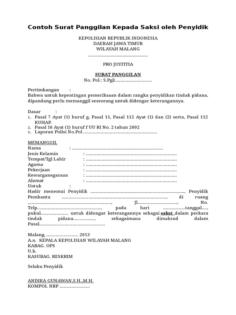 Contoh Surat Panggilan Saksi Dari Kepolisian